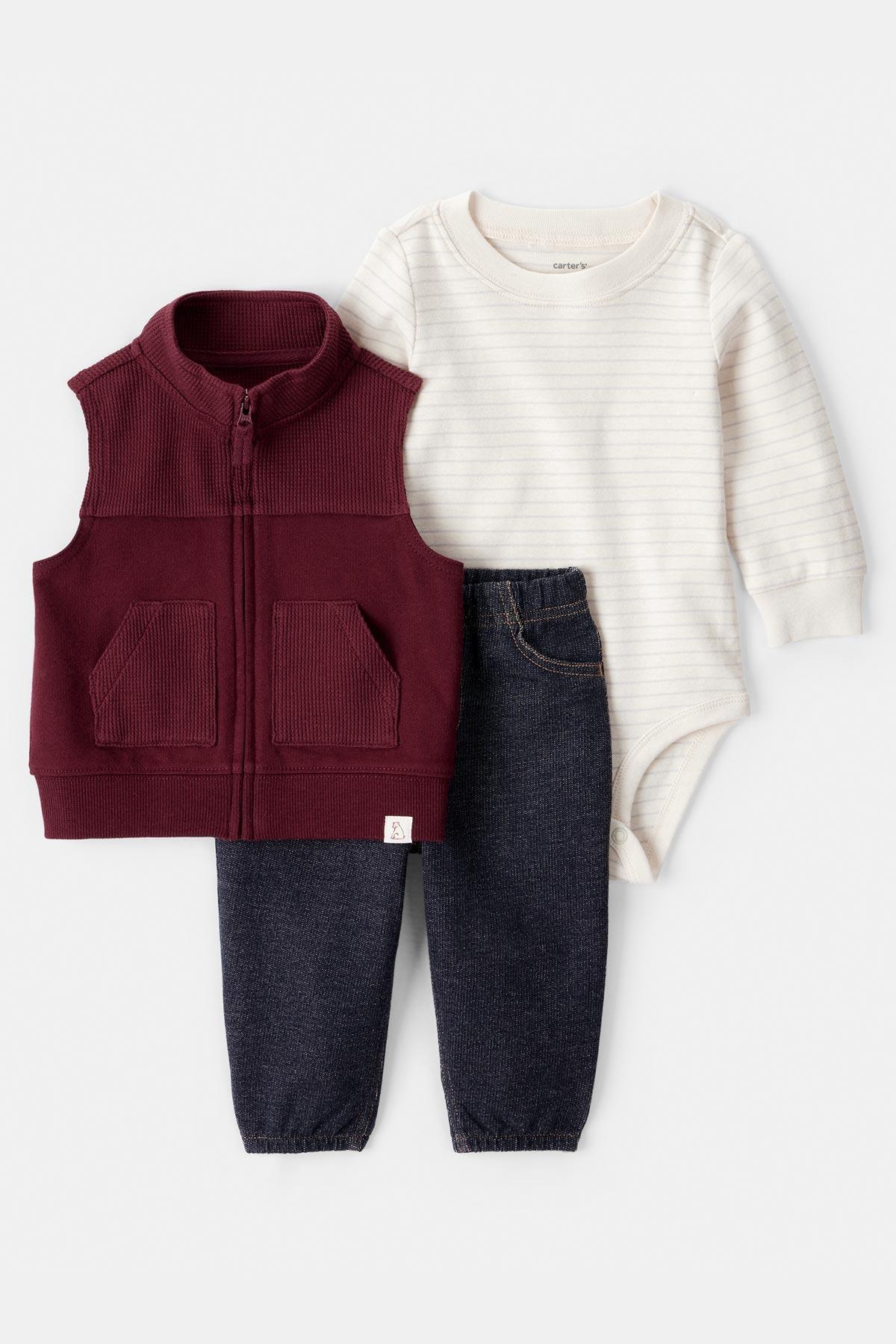 • Özellikler Kolay giyim için yelek, uzun kollu üst ve kot pantolondan oluşan 3 parçalı settir