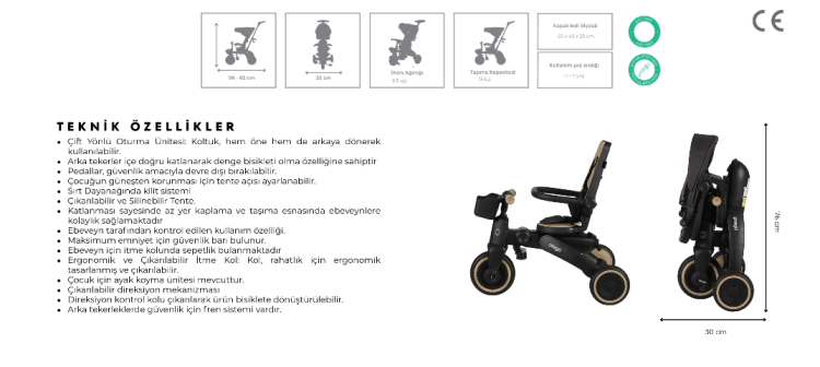 • Direksiyon kontrol kolu çıkarılarak ürün bisiklete dönüştürülebilir.