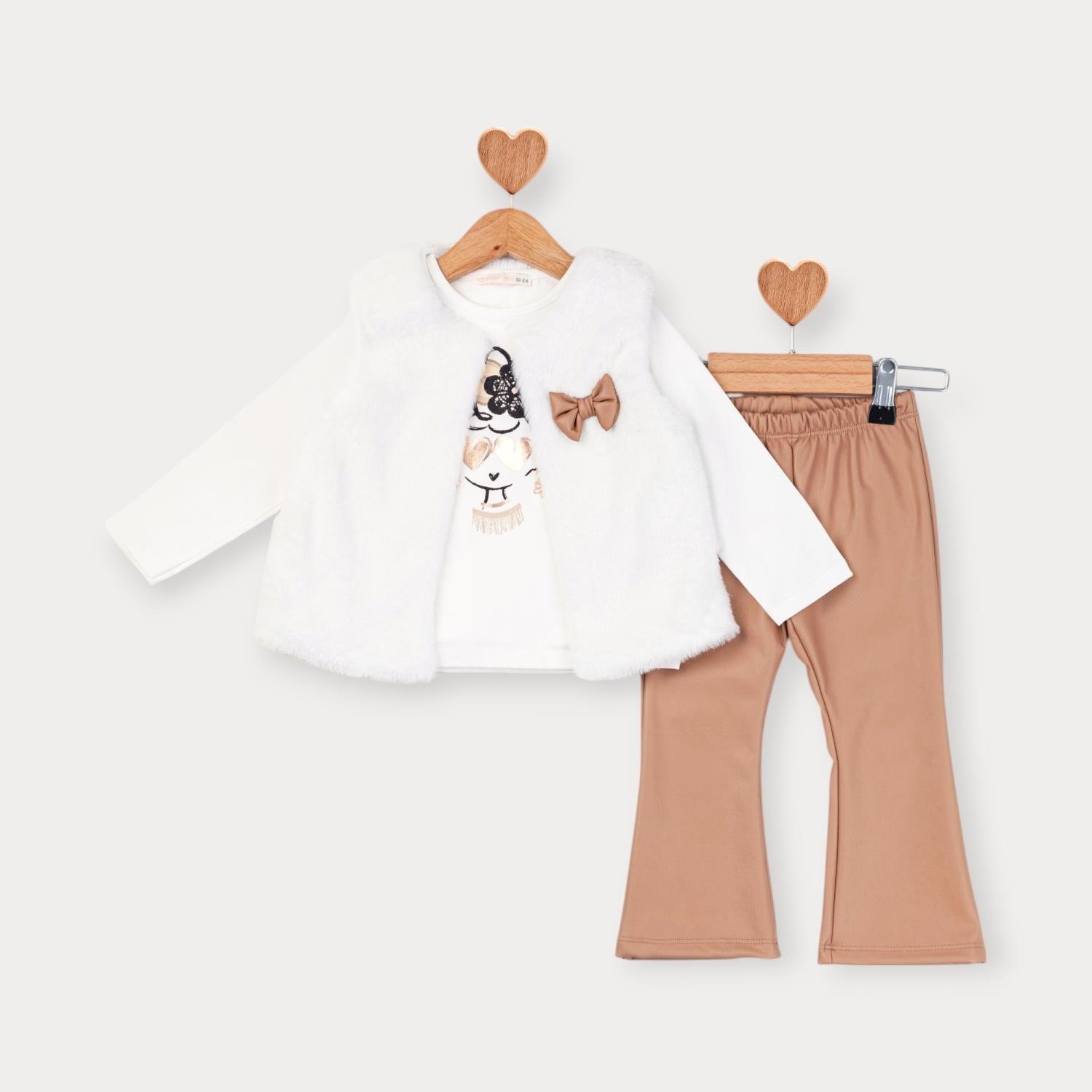 Kız Çocuk Peluş Yelekli İspanyol Paça Deri Pantolonlu 3 lü Takım (BBR-7842)